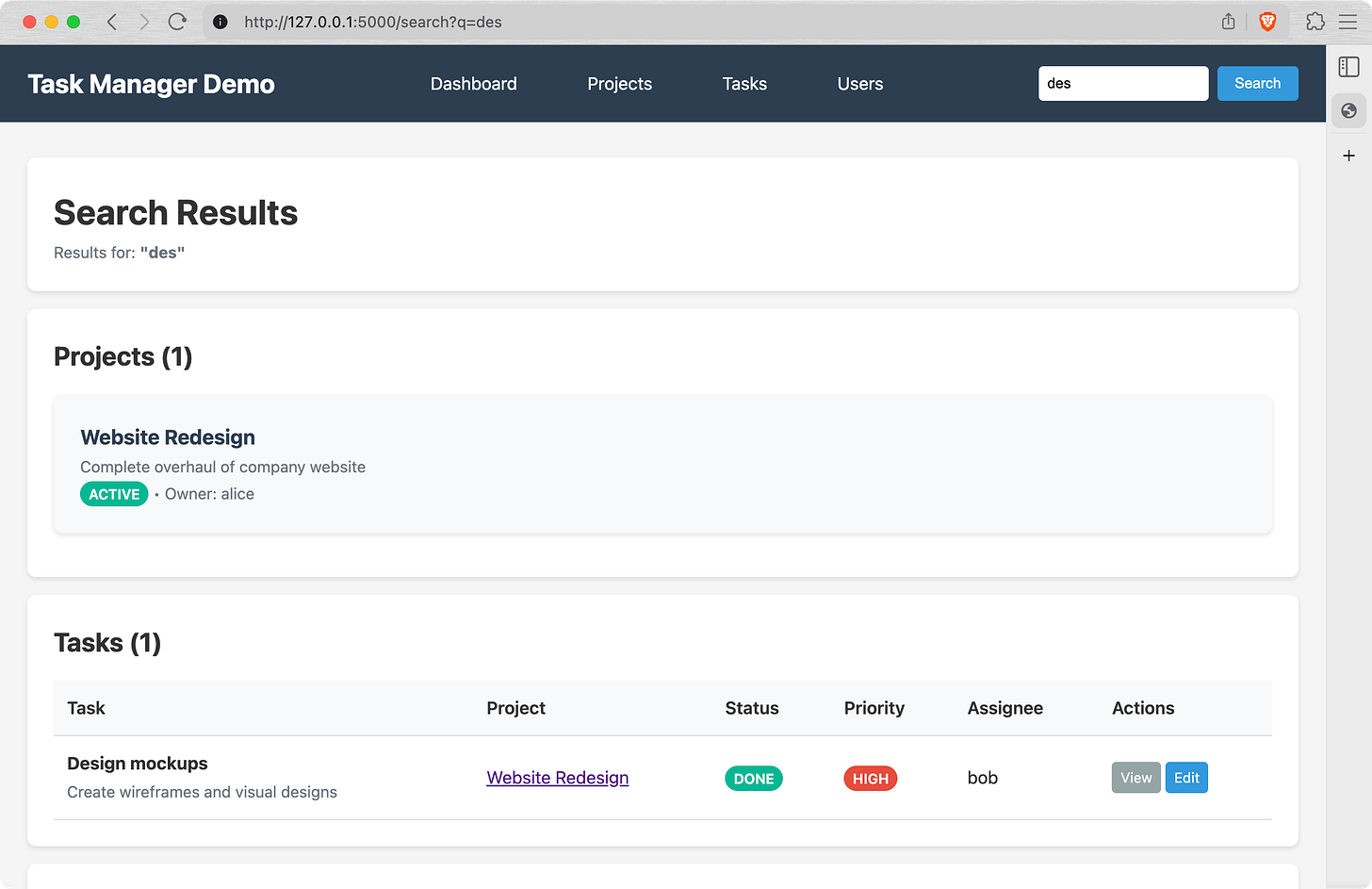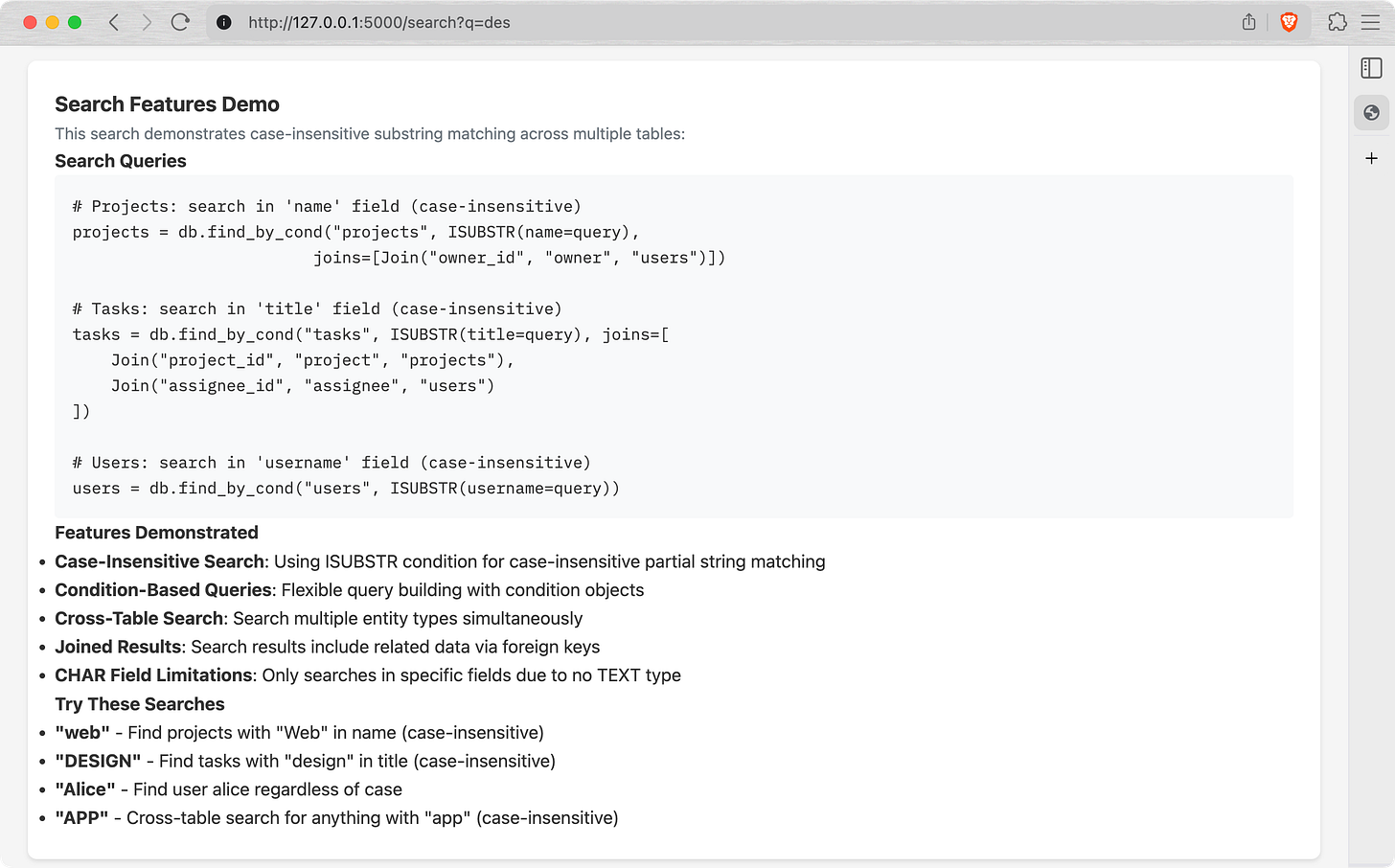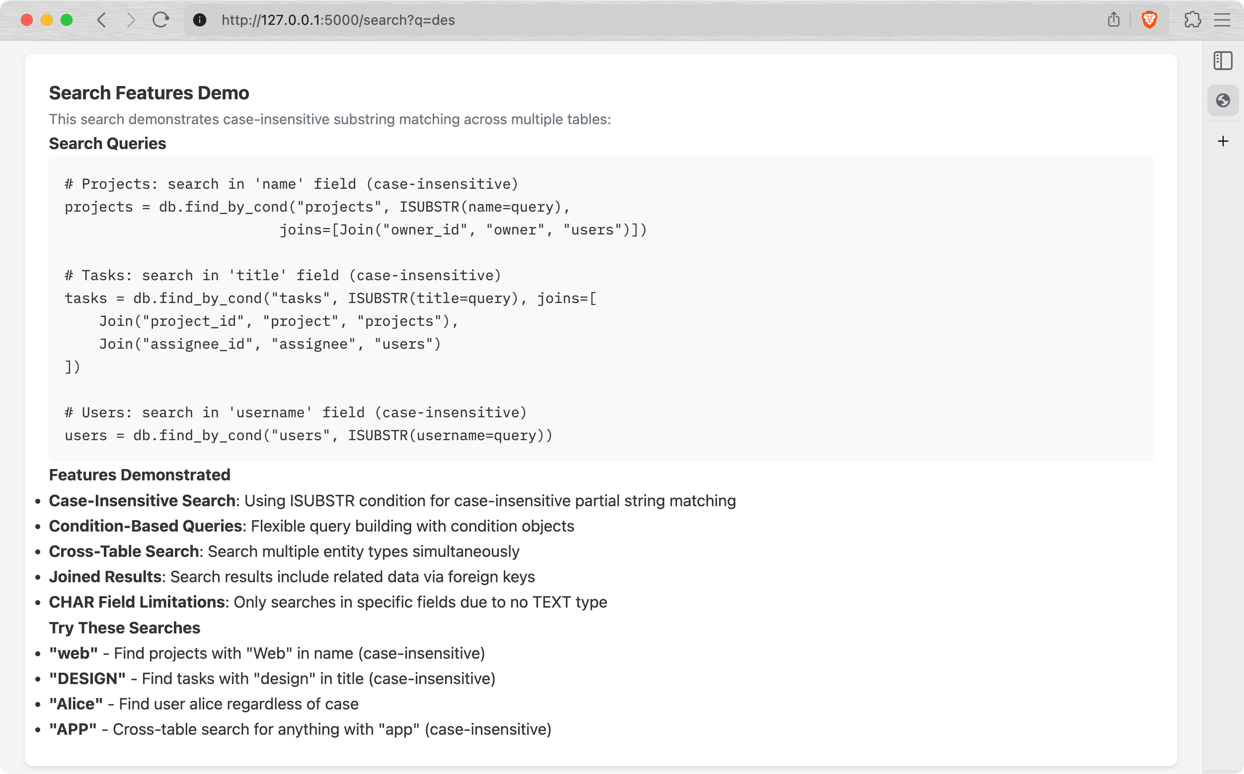 python demo/app.pyThen open http://127.0.0.1:5000 in your browser, and Bob's your uncle. The schemas and tables are all pre-created and filled with demo data, so you can browse and edit it, checking the explanation at the bottom of the page. For example, you can try to search design-related projects and tasks by "des" query: