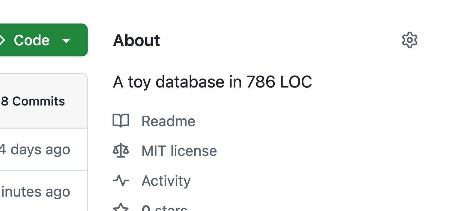 One of the features of this database at the moment is it's size - its core implementation is less than 800 lines of Python code! I decided that it would be nice to highlight it in the Github description, and came up with a simple script, update_description.sh, which I run once in a while to count the lines of bazoola/*.py and update the repo description.