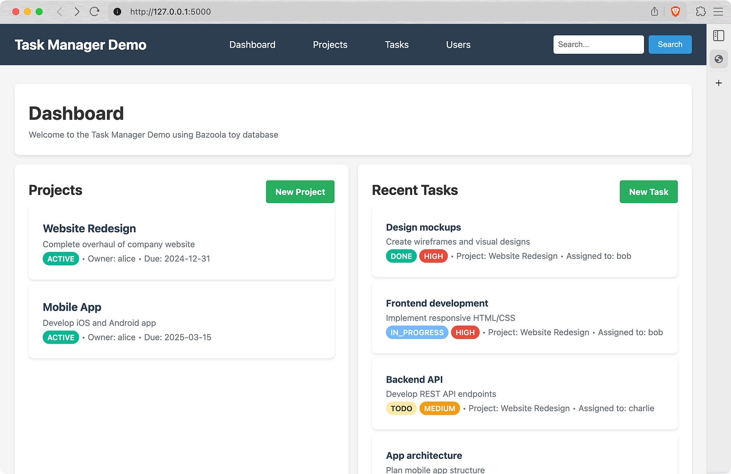 Meet the "Task manager" - a flask-based app demonstrating current capabilities of Bazoola: